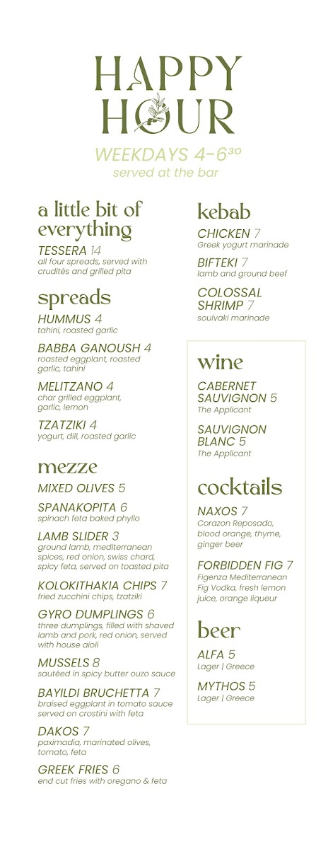 Vegetarian options abound with dishes like the Vegetable Moussaka ($30) and Mujaddara Rice ($11). Complement your meal with delightful sides such as Greek Fries ($13) or Lemon Potatoes ($11). Don't miss the chance to indulge in sweet treats like the Baklava ($10) or Lemon Olive Oil Cake ($11) to finish your meal on a sweet note.